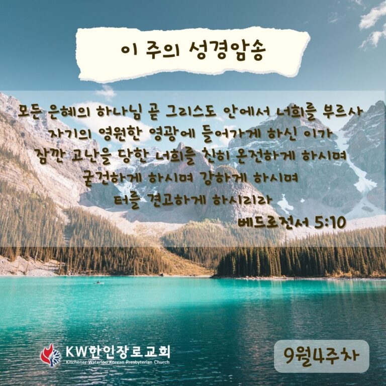 Slide Background이웃과 함께 하나님을 예배하고기도에 힘쓰는 교회(행 10:2)주보주일설교Build & Design 2025 가을 사무엘 학교 2025 성경통독표 예배1부 예배 : 주일 오전 9시 (본당, 1층)2부 예배 : 주일 오전 11시 (본당, 1층)아동부 예배 : 주일 오전 11시 (그레이스홀, 2층)청소년부 예배 : 주일 오전 11시 (세미나실, B1)청년부 : 주일 오후 1시 15분 (본당, 1층) 토요 아침 기도회 : 토요일 오전 8시 (본당, 1층)자세히 보기 교회 이모저모교회 각종 행사 갤러리/블로그자세히 보기 온라인헌금온라인 헌금 안내자세히 보기 권사 및 안수집사 임직예배 추수감사절 특별 새벽예배 권사 및 안수집사 임직예배 교회창립 53주년 “권사 및 안수집사“ 임직예배 일시 : 9월 21일(주일) 오전 11시 권사임직 : 김윤경 김은경 윤정화 윤숙경 권사인준 : 손령희 안수집사 : 김동범 진혁준 홍의표 안수집사인준 : 권혁용 임현태 장소 : KW한인장로교회 본당 추수감사절 특별 새벽예배 추수감사절 특별 새벽예배 주제 : ” 받은 복을 세어 보아라 ” (엡 1:3) 일정 : 10월 6일 ~ 11일 월-금 새벽 6시, 토요일 7시