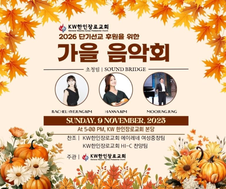 Slide Background이웃과 함께 하나님을 예배하고기도에 힘쓰는 교회(행 10:2)주보주일설교Build & Design 2025 가을 사무엘 학교 2025 성경통독표 예배1부 예배 : 주일 오전 9시 (본당, 1층)2부 예배 : 주일 오전 11시 (본당, 1층)아동부 예배 : 주일 오전 11시 (그레이스홀, 2층)청소년부 예배 : 주일 오전 11시 (세미나실, B1)청년부 : 주일 오후 1시 15분 (본당, 1층) 토요 아침 기도회 : 토요일 오전 8시 (본당, 1층)자세히 보기 교회 이모저모교회 각종 행사 갤러리/블로그자세히 보기 온라인헌금온라인 헌금 안내자세히 보기 권사 및 안수집사 임직예배 권사 및 안수집사 임직예배 교회창립 53주년 “권사 및 안수집사“ 임직예배 일시 : 9월 21일(주일) 오전 11시 권사임직 : 김윤경 김은경 윤정화 윤숙경 권사인준 : 손령희 안수집사 : 김동범 진혁준 홍의표 안수집사인준 : 권혁용 임현태 장소 : KW한인장로교회 본당