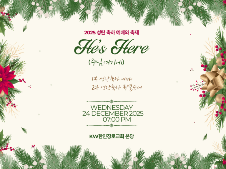 Slide Background이웃과 함께 하나님을 예배하고기도에 힘쓰는 교회(행 10:2)주보주일설교KakaoTalk_Photo_2025-11-22-21-27-29 2025 가을 사무엘 학교 2025 성경통독표 예배1부 예배 : 주일 오전 9시 (본당, 1층)2부 예배 : 주일 오전 11시 (본당, 1층)아동부 예배 : 주일 오전 11시 (그레이스홀, 2층)청소년부 예배 : 주일 오전 11시 (세미나실, B1)청년부 : 주일 오후 1시 15분 (본당, 1층) 토요 아침 기도회 : 토요일 오전 8시 (본당, 1층)자세히 보기 교회 이모저모교회 각종 행사 갤러리/블로그자세히 보기 온라인헌금온라인 헌금 안내자세히 보기 권사 및 안수집사 임직예배 권사 및 안수집사 임직예배 교회창립 53주년 “권사 및 안수집사“ 임직예배 일시 : 9월 21일(주일) 오전 11시 권사임직 : 김윤경 김은경 윤정화 윤숙경 권사인준 : 손령희 안수집사 : 김동범 진혁준 홍의표 안수집사인준 : 권혁용 임현태 장소 : KW한인장로교회 본당