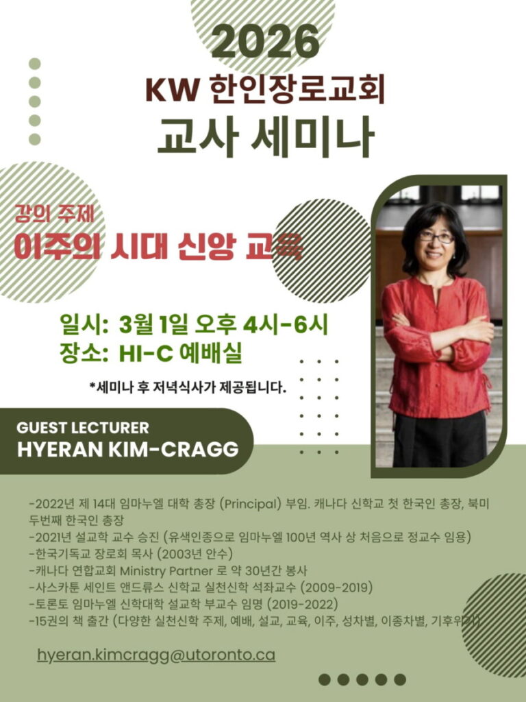 토론토 임마누엘 대학교 총장이신 김혜란 교수님을 모시고 “이주의 시대 신앙 교육”이라는 주제로 교사 세미나를 개최 하였습니다. 출애굽기의 게르솜과 마태복음의 예수님에 대한 내용을 이주의 관점에서 이야기로 풀어주셨고, 이어지는 소그룹 토론시간에서는 교사로서 아이들이 느끼는 캐나다의 삶에 대해서 그리고 우리 교회가 감당해야 할 일들에 대해서 생각하고 고민하는 시간을 갖었습니다.